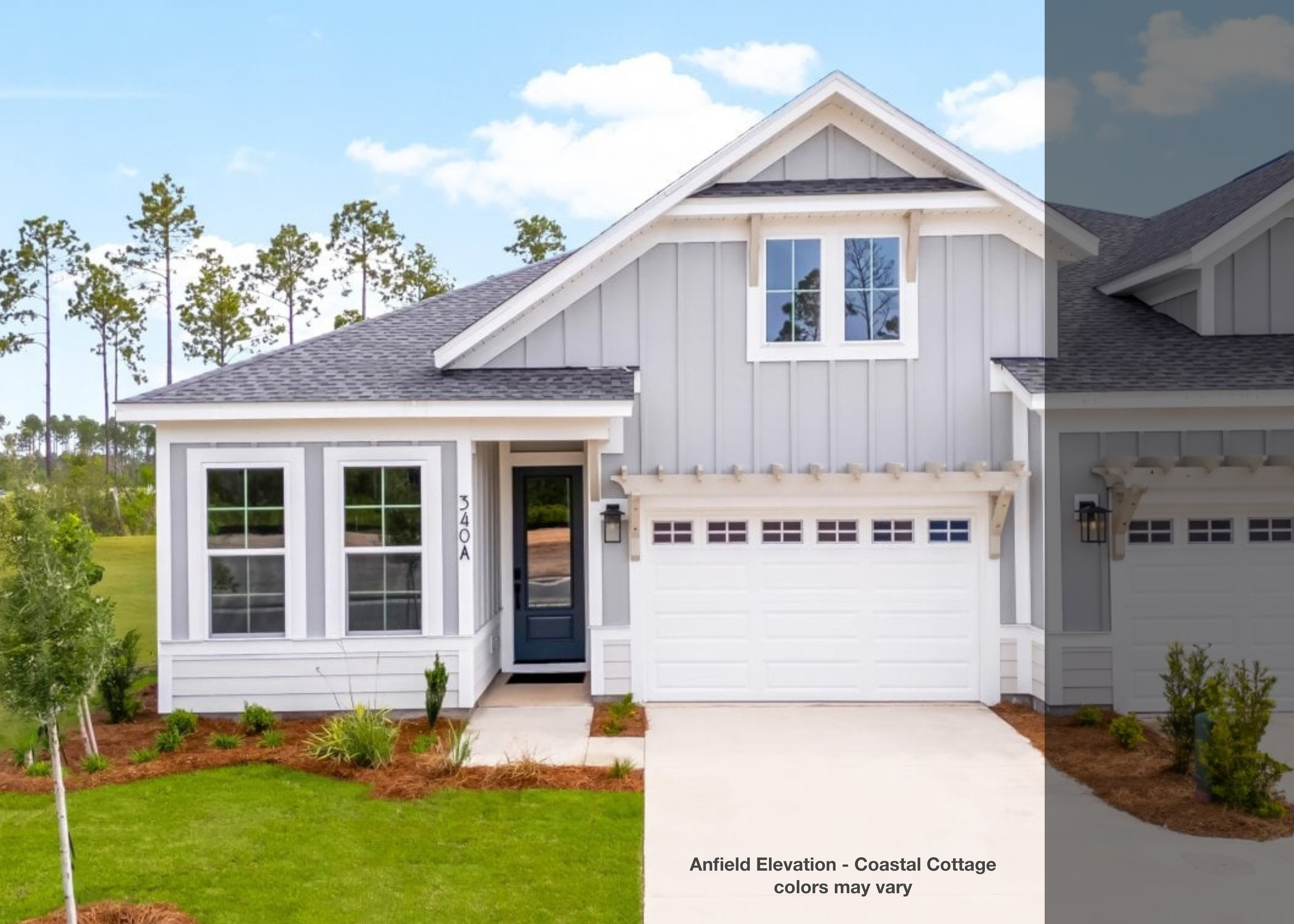 Built by Fischer Homes, this beautifully designed Anfield Coastal Cottage in The Villas at Longleaf Park neighborhood at Watersound Origins offers thoughtfully planned single-level living with 2 bedrooms, 2 full baths, plus a powder room, all complemented by a peaceful water view. With included 10-foot ceilings and an open kitchen and family room layout, the home feels bright, spacious, and inviting. Upgrades include quartz kitchen countertops, a farmhouse sink, upgraded kitchen and bath cabinetry, a stainless canopy range hood, luxury vinyl flooring throughout, and tile extended to the ceiling in both full baths. The Owner's Suite features the Luxury Bath Suite and an expansive walk-in closet. An installed Smart Home security package allows for remote access and monitoring, offering added security and everyday ease.