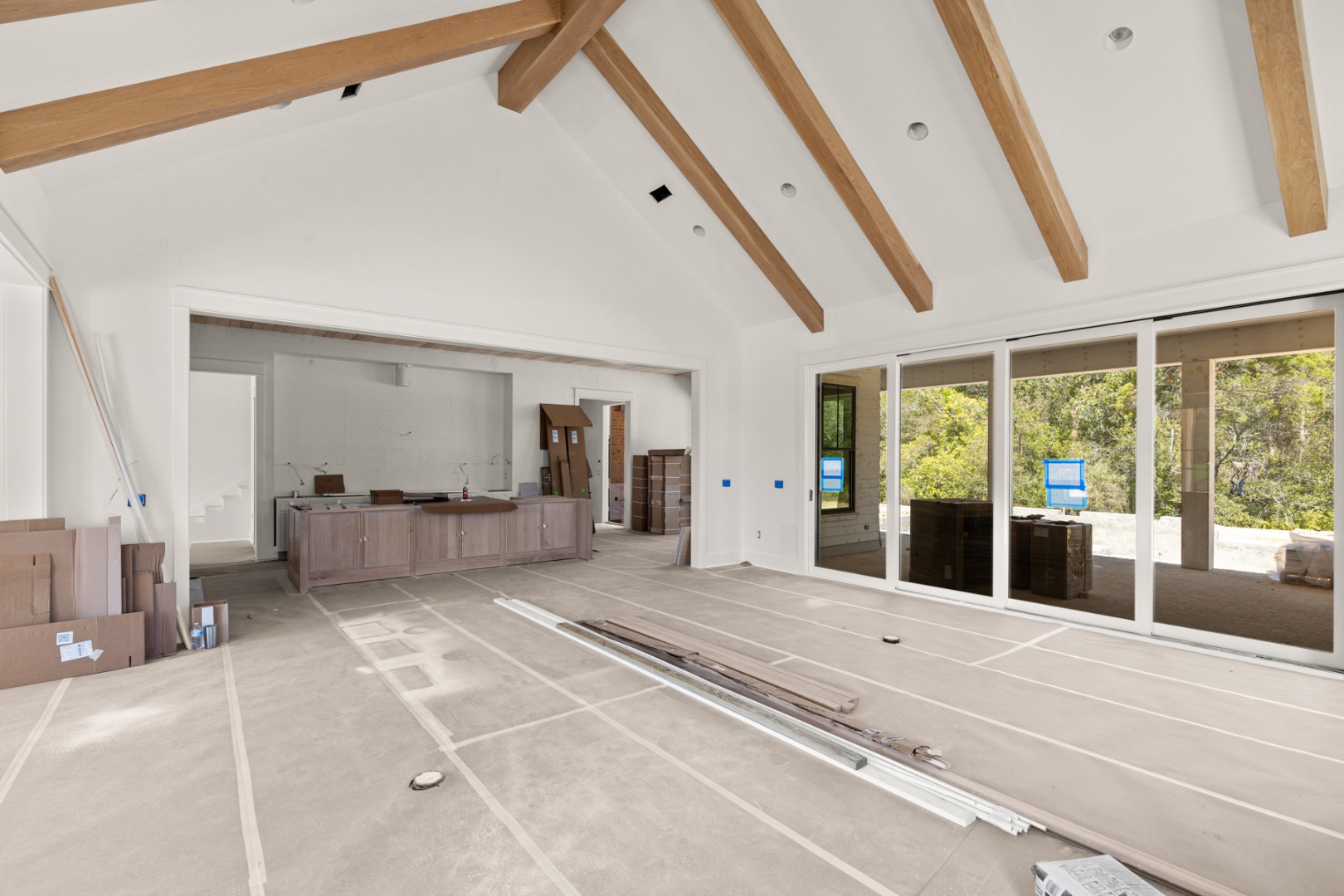 The main living area is located at the back of the home, defined by vaulted ceilings with exposed wood beams and a wood-burning fireplace. A 16' sliding glass door extends the space to the rear porch, while the adjacent dining area features a 12' slider, creating multiple connections to the outdoor living areas.