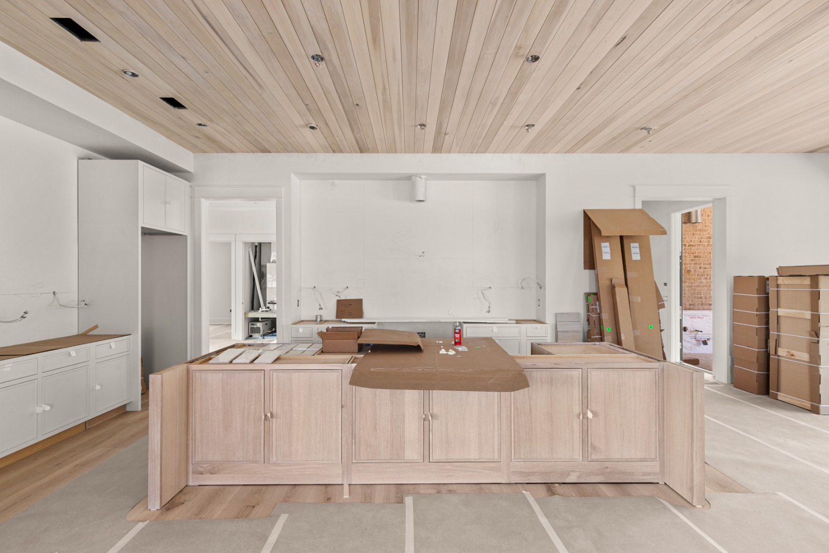 The kitchen is centrally positioned between the living and dining areas, anchored by a large island and supported by a walk-in pantry and separate butler's pantry with wet bar. Integrated cabinetry conceals a full appliance suite including a dual fuel range, multiple refrigeration units, and additional beverage and ice storage.