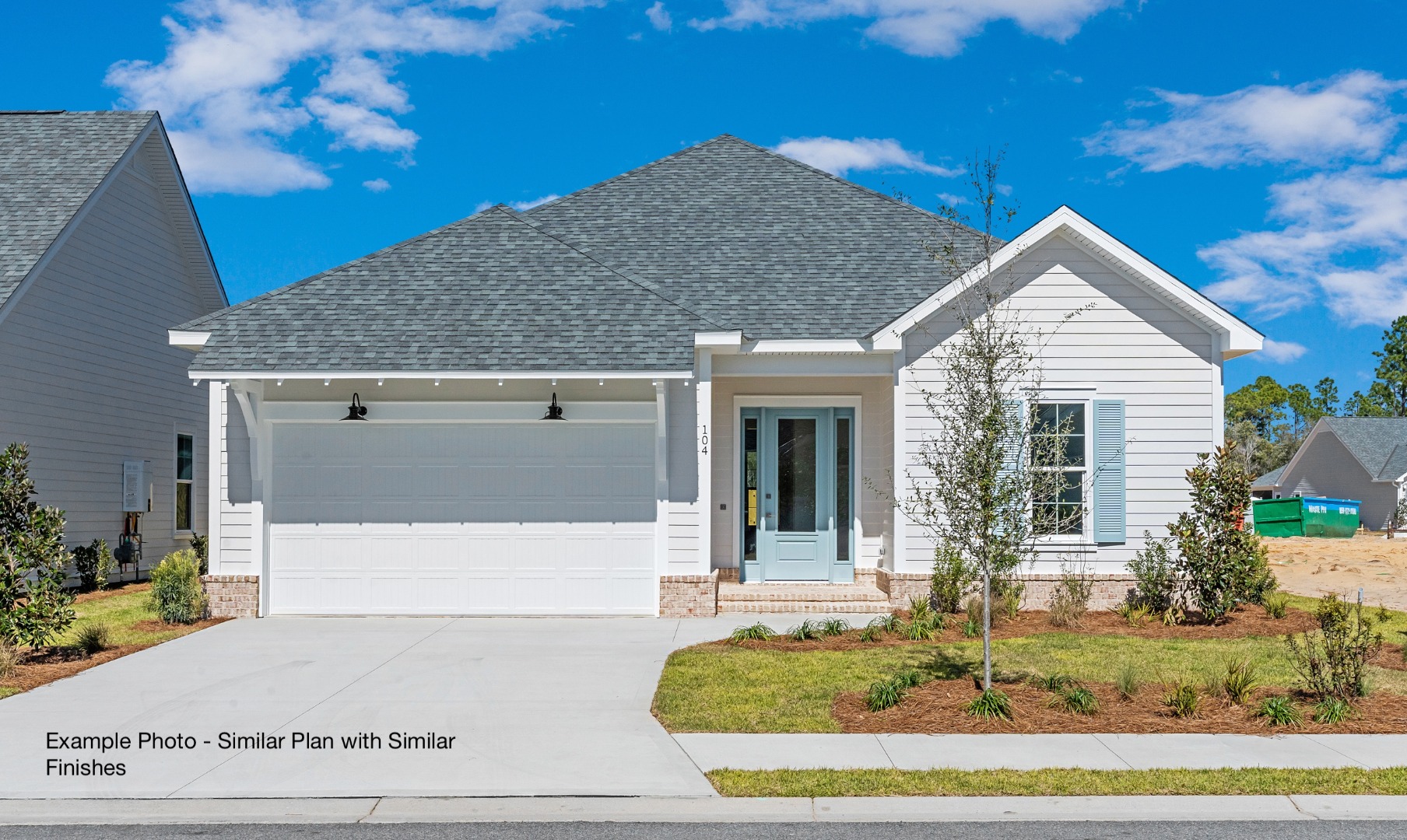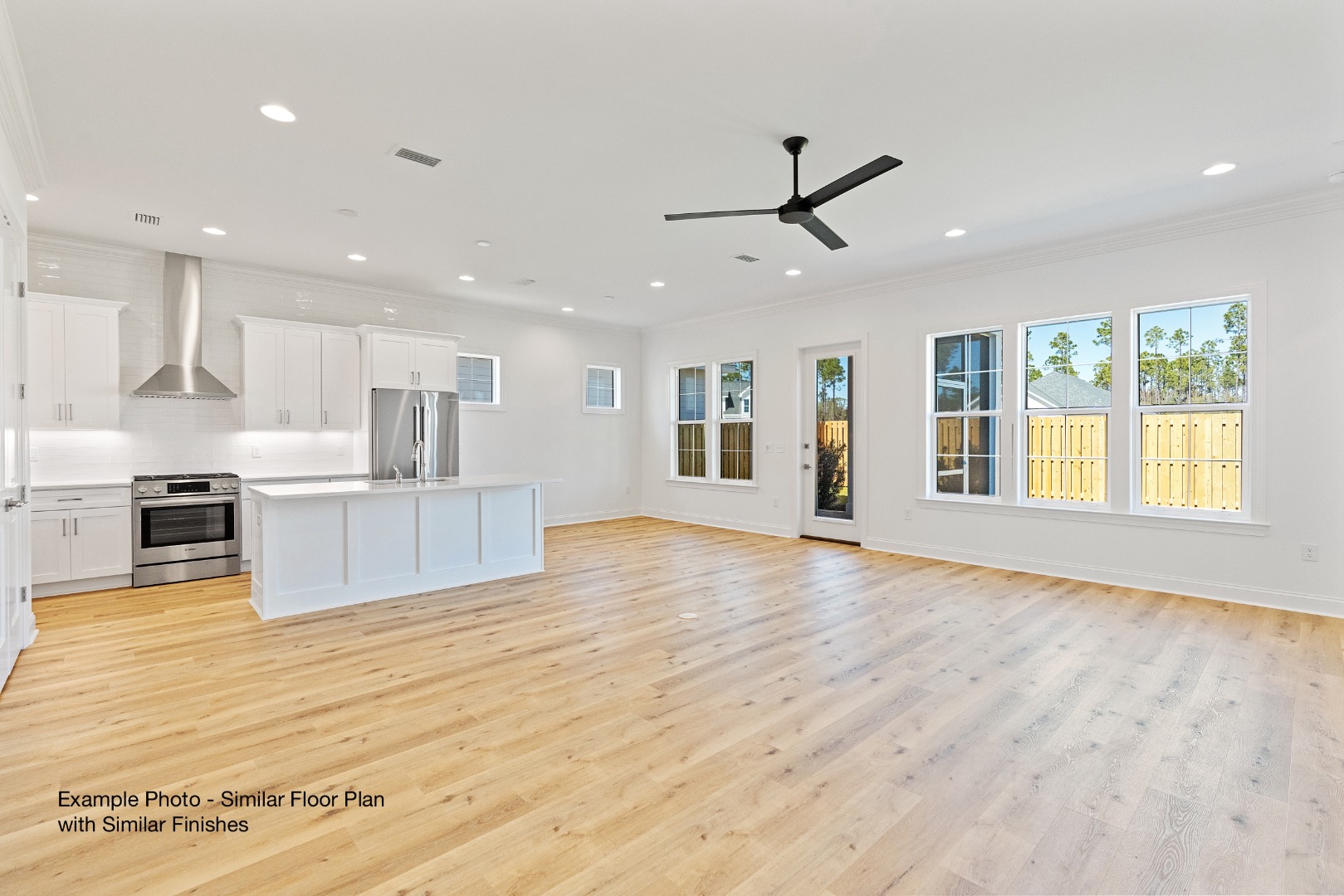 Welcome to the Alana II by Huff Homes, a 1,690 square foot single-level residence located in the Longleaf Park neighborhood of Watersound Origins, offering 2 bedrooms, 2 bathrooms, a dedicated study, and a 2-car garage. Entering through the front porch, the foyer opens to a central living space with clear sightlines through the home. The living room connects directly to the dining area and kitchen, creating a continuous layout that extends to the screened rear porch. The kitchen includes a large island, quartz countertops, wood cabinetry with soft-close features, upgraded Bosch appliance package in stainless steel, vent hood, and a tiled backsplash.