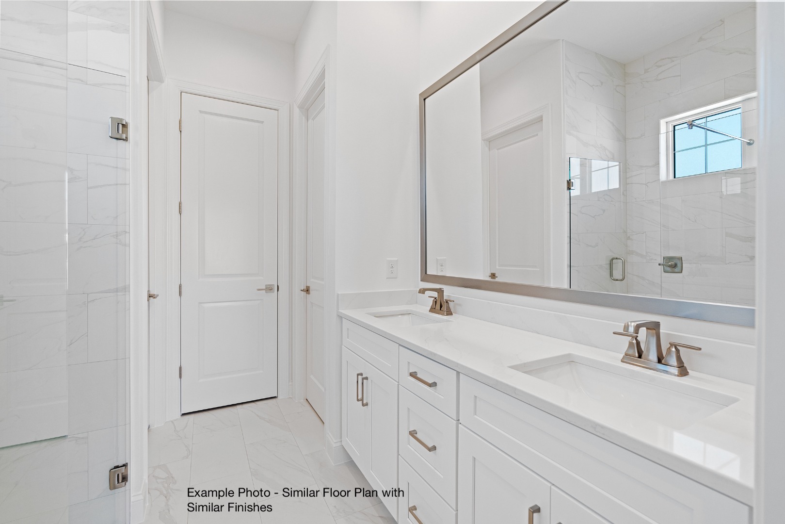 The primary suite is privately positioned at the rear left side of the home and includes a walk-in closet and a bathroom with a tiled shower, quartz dual vanity, and porcelain tile flooring. A secondary bedroom and full bathroom are located near the front of the home, offering separation for guests.