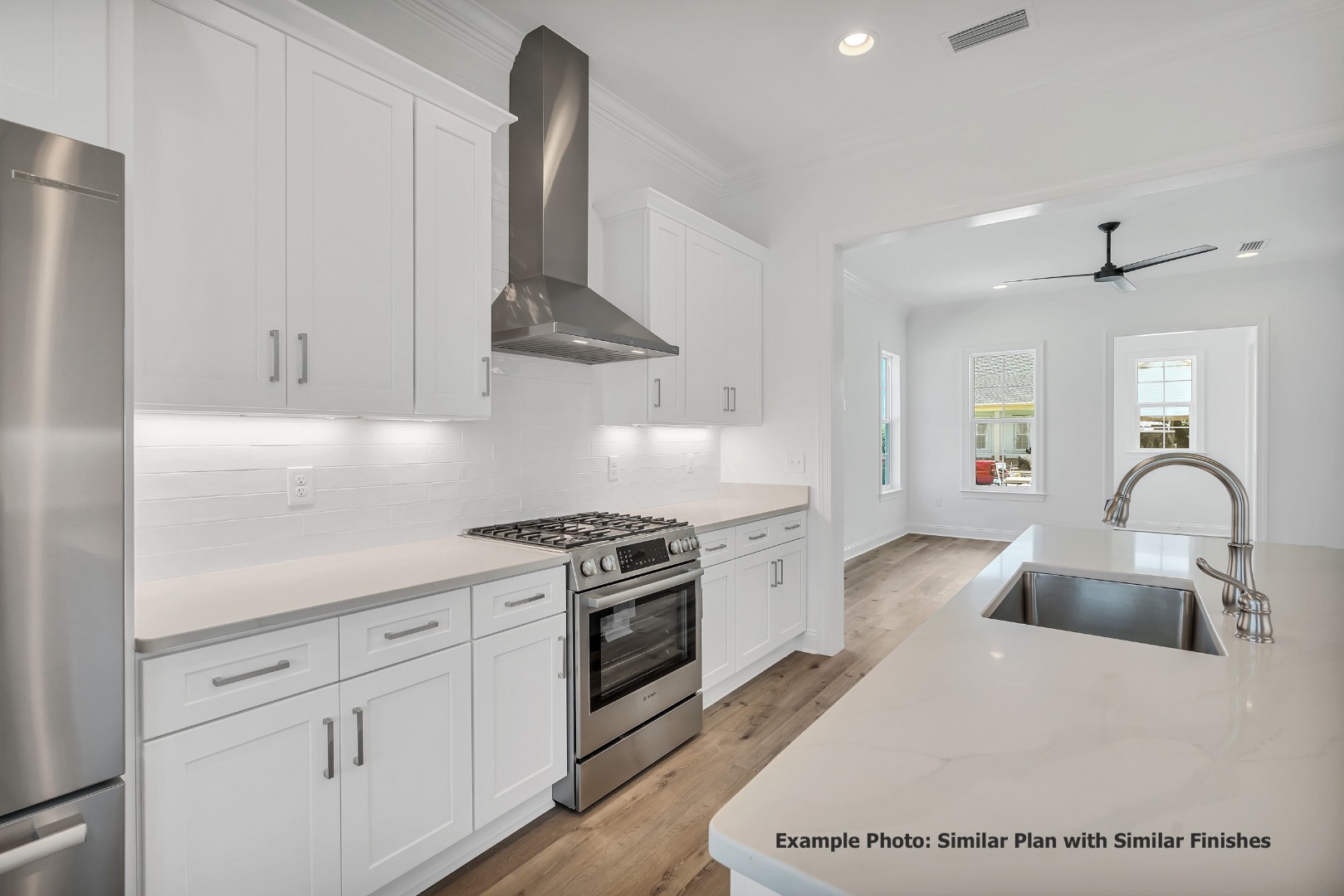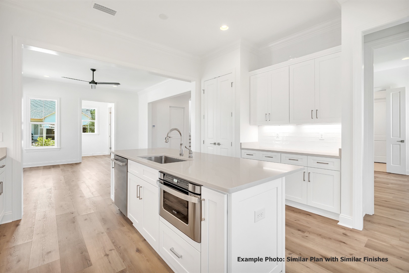The open-concept living, dining, and kitchen areas create a bright and inviting central gathering space, enhanced by 10-foot ceilings, crown molding in the main living areas, and durable luxury vinyl plank flooring. The kitchen is appointed with quartz countertops, stainless steel appliances, soft-close wood cabinetry, and a stylish backsplash, offering both beauty and everyday practicality. Privately positioned at the rear of the home, the Owner's Suite features a spacious walk-in closet and a well-appointed bath with tiled shower, quartz vanity, and quality finishes throughout. A secondary bedroom and full bath near the front of the home provide comfortable accommodations for guests, while the dedicated study offers flexibility for a home office or additional living space.